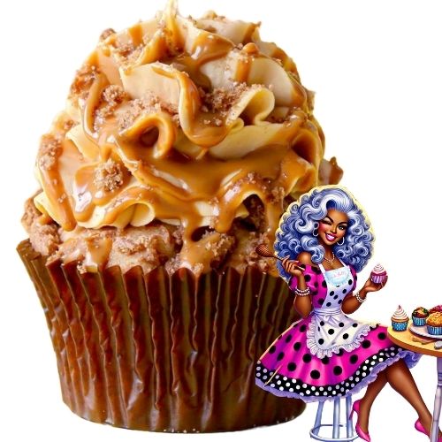 Behold a cupcake masterpiece: a brown sugar base with a sweet, subtle molasses flavor that beckons with its rich warmth. Crowned with a luscious white caramel frosting, each swirl dances with notes of buttery caramel goodness. A gentle dusting of brown sugar adds an irresistible sparkle, making this treat as beautiful as it is delicious. It’s a bite-sized celebration, crafted to enchant your day.